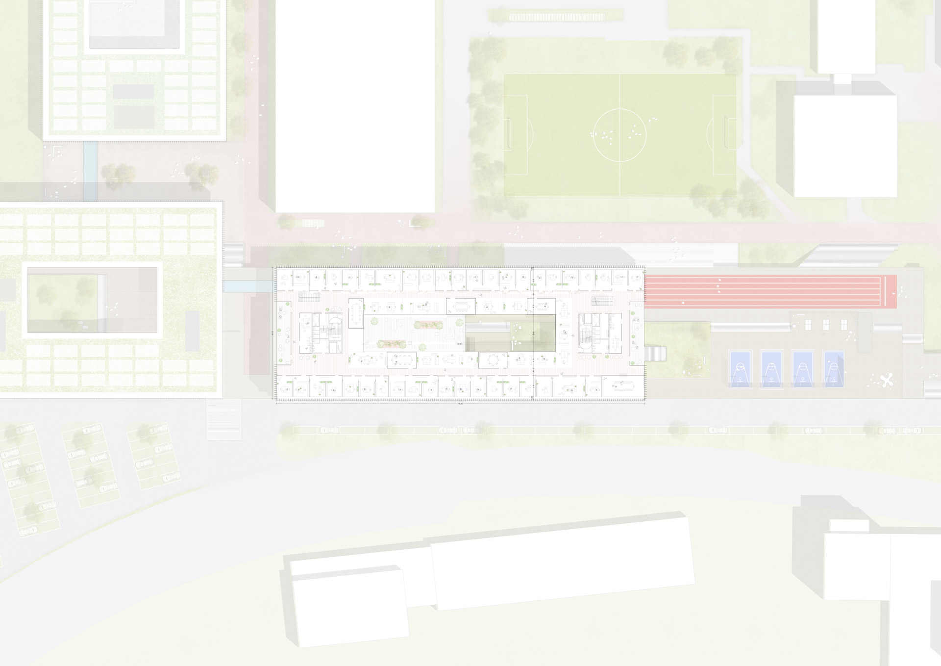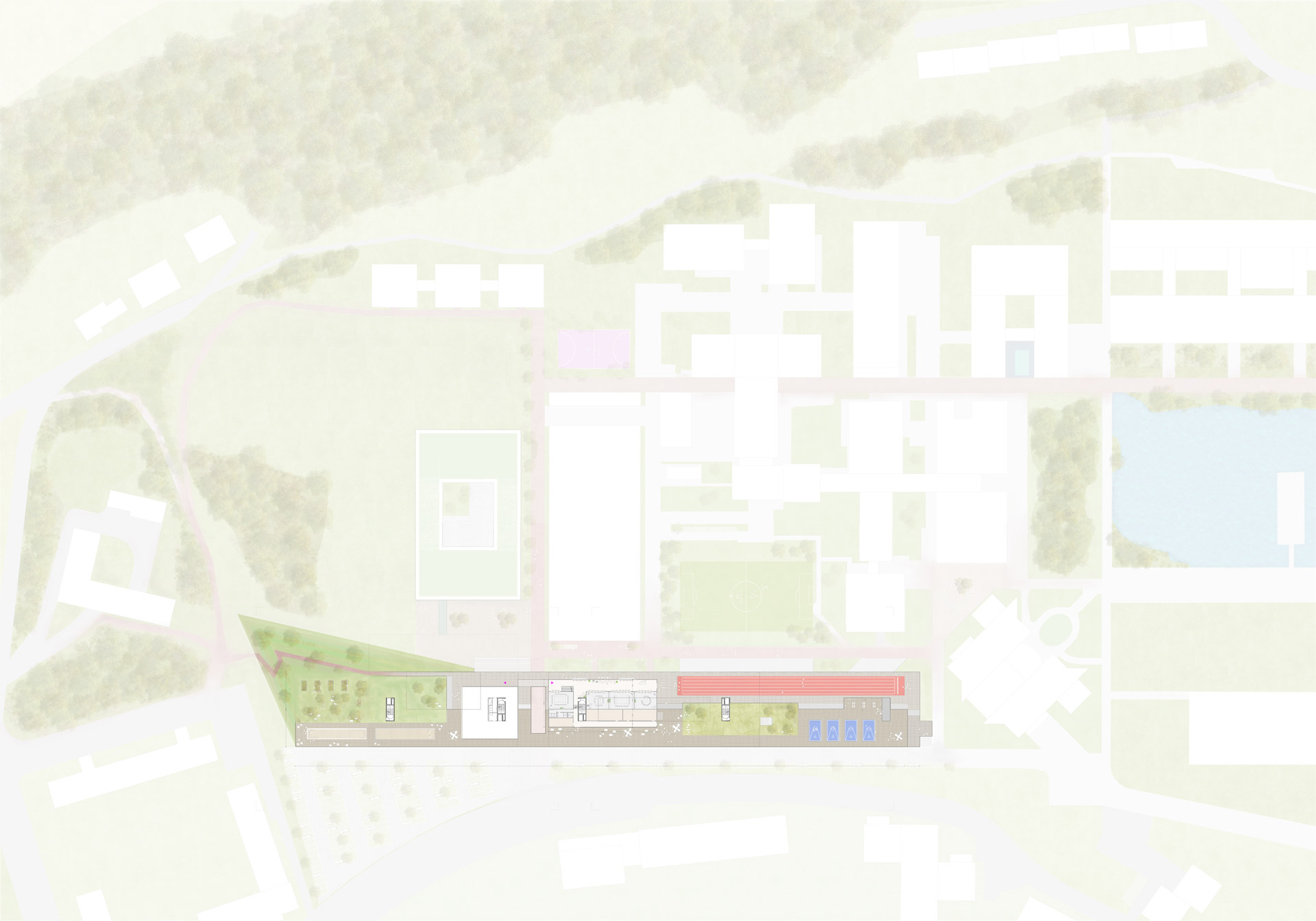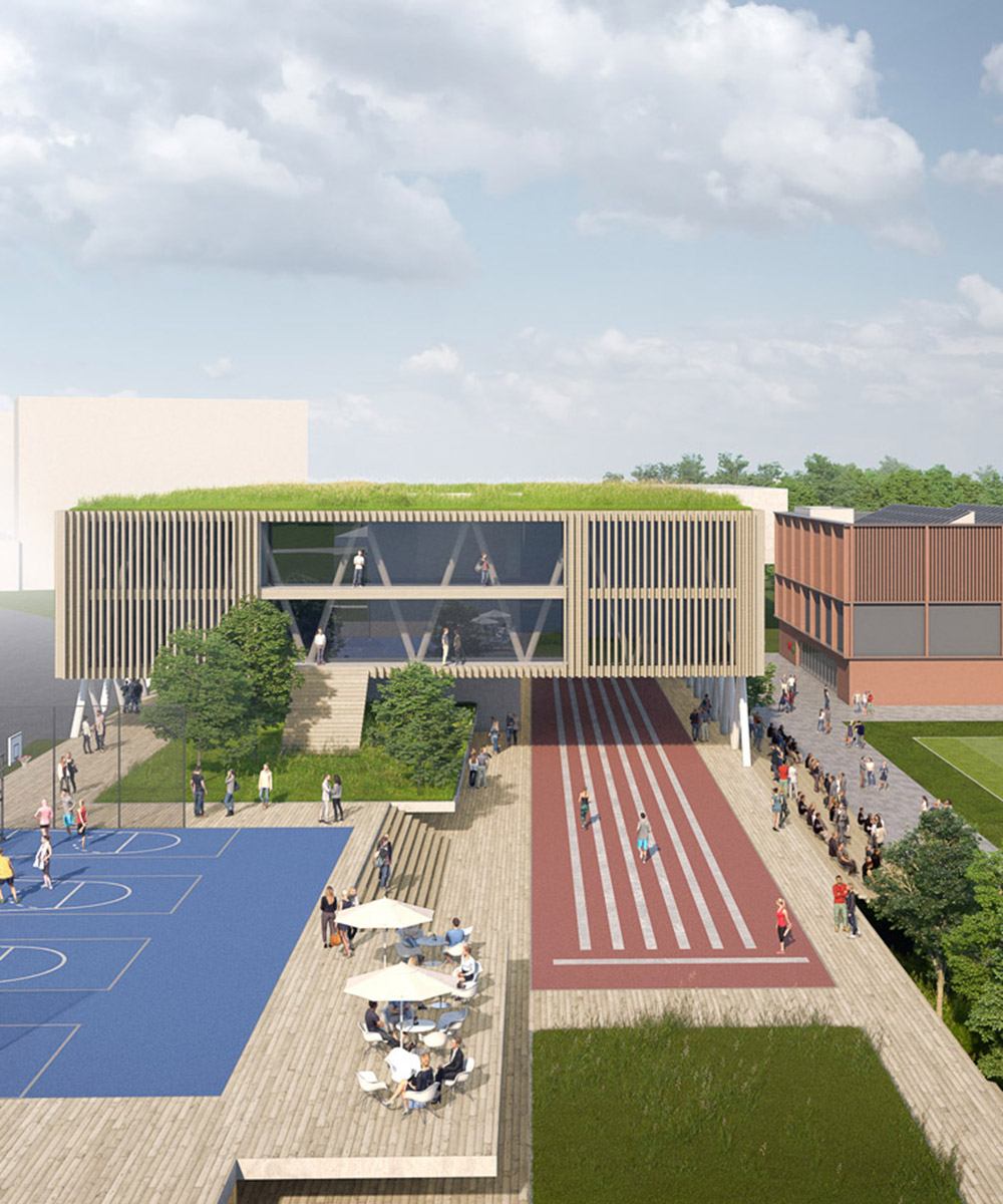 The so-called dike forms the new urban planning element in the south of the campus. The dyke is a hybrid of a clear east-west running development axis, is a recreation, sports and communication mile, serves as a foundation and entrance for the buildings of the Houses of Schools and accommodates the stationary traffic in its interior.