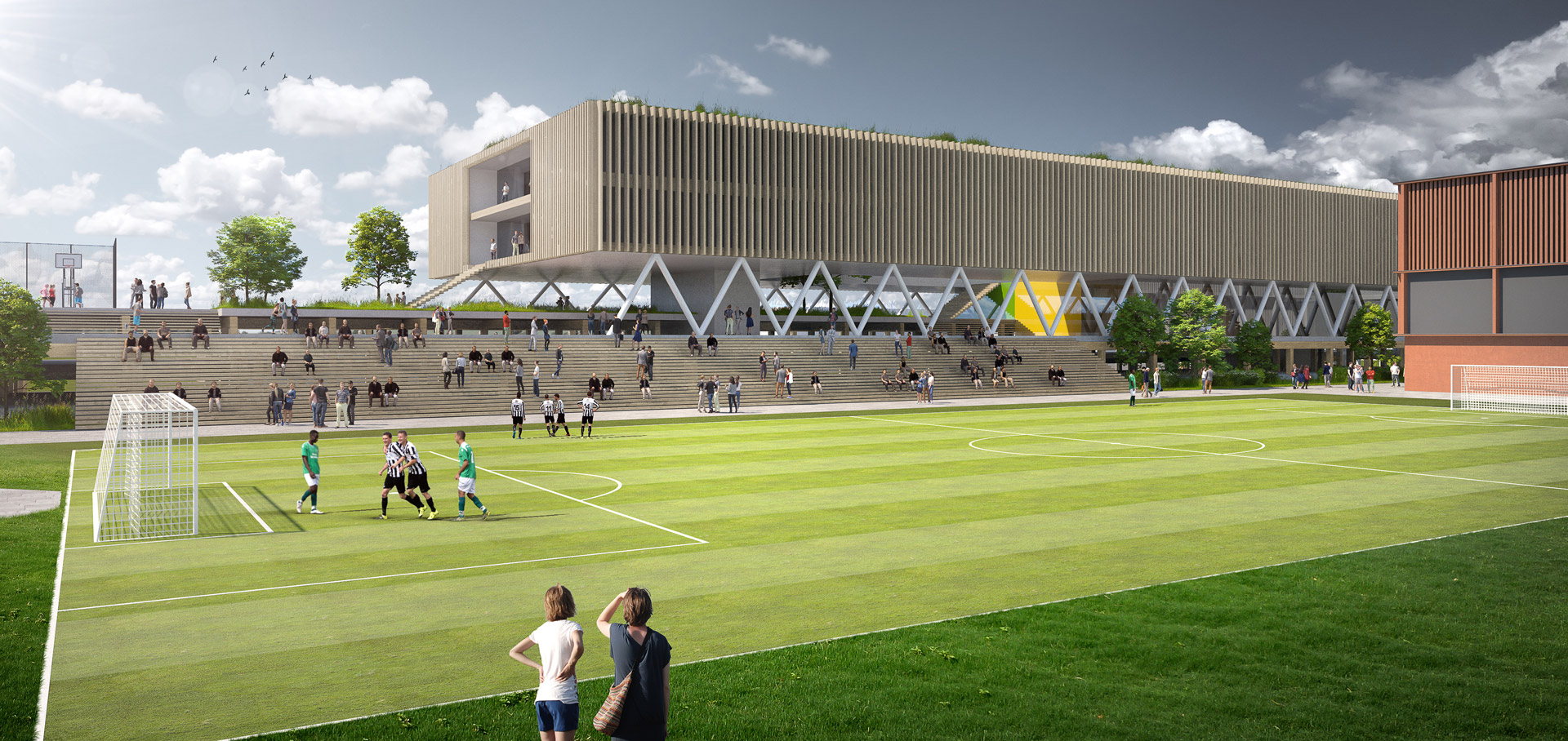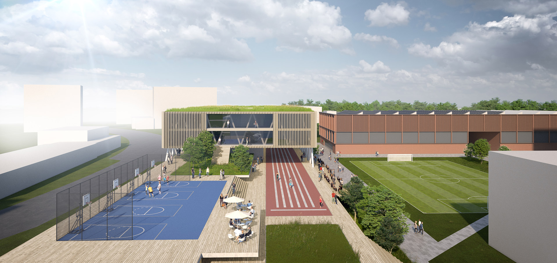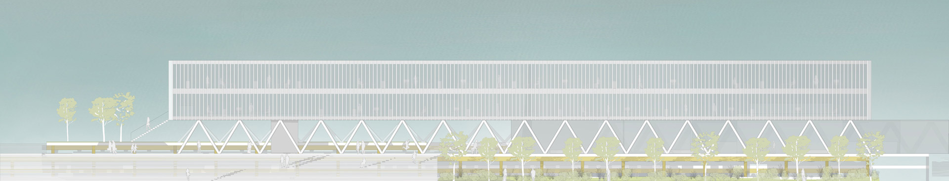 The so-called dike forms the new urban planning element in the south of the campus. The dyke is a hybrid of a clear east-west running development axis, is a recreation, sports and communication mile, serves as a foundation and entrance for the buildings of the Houses of Schools and accommodates the stationary traffic in its interior.
