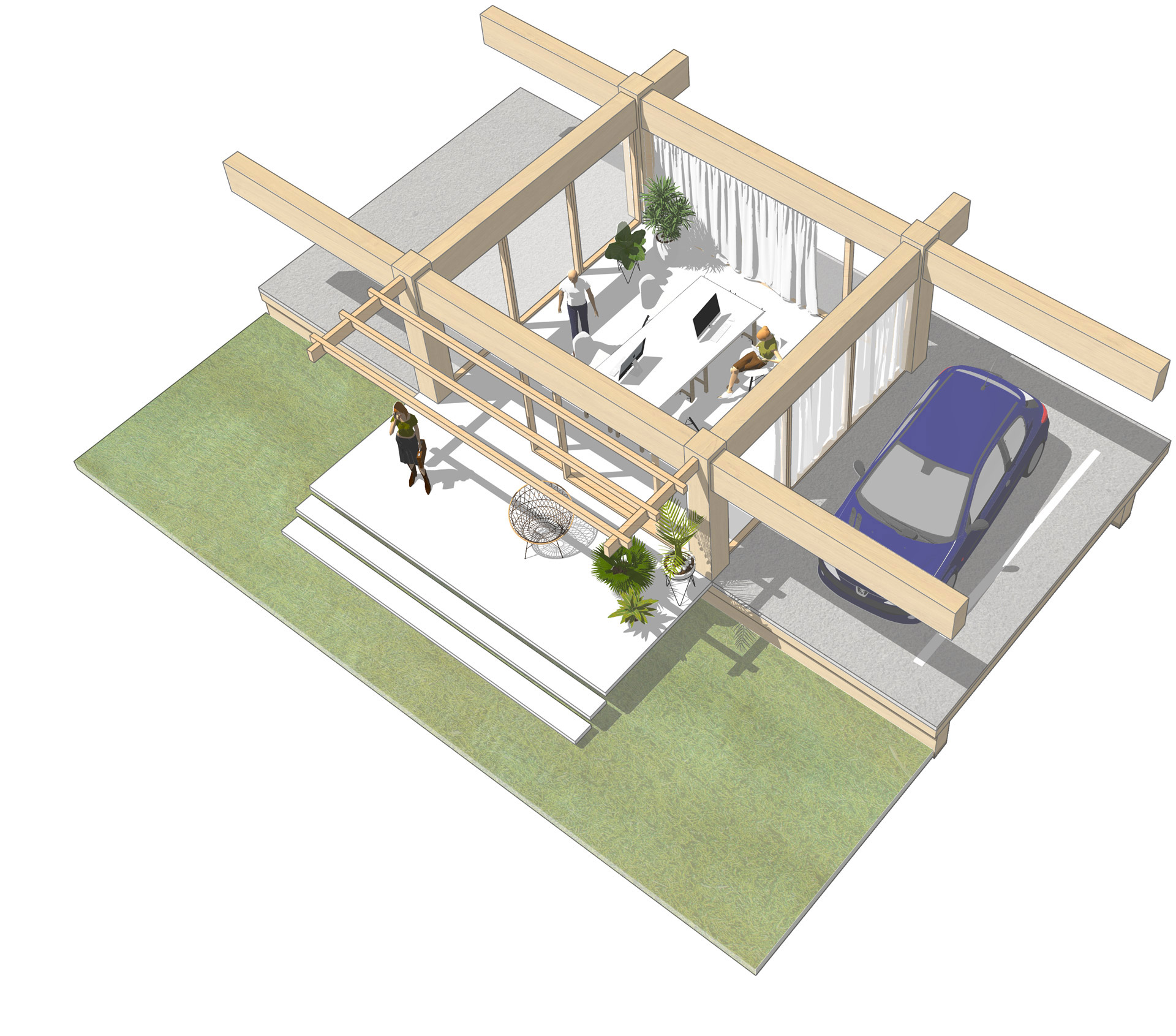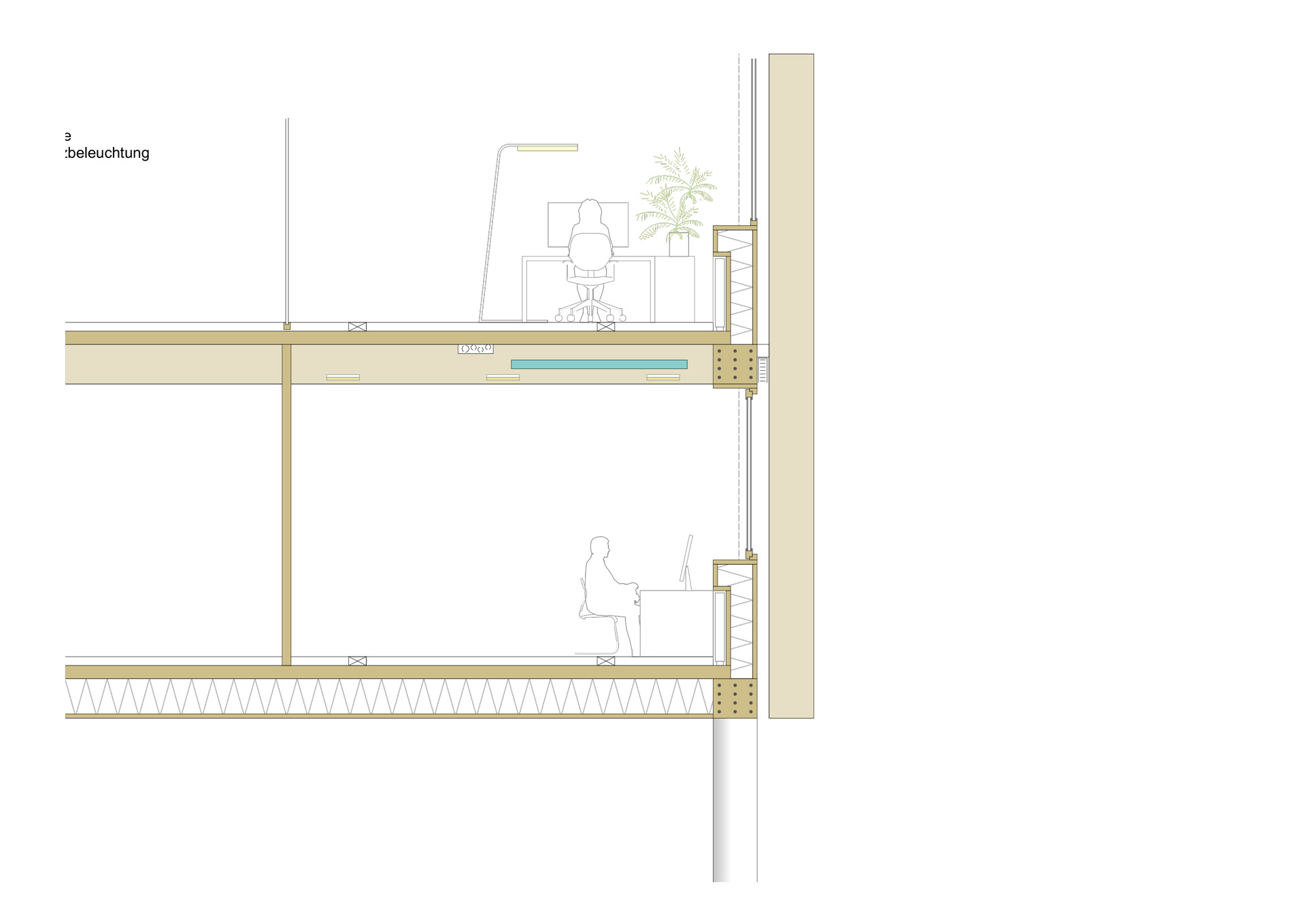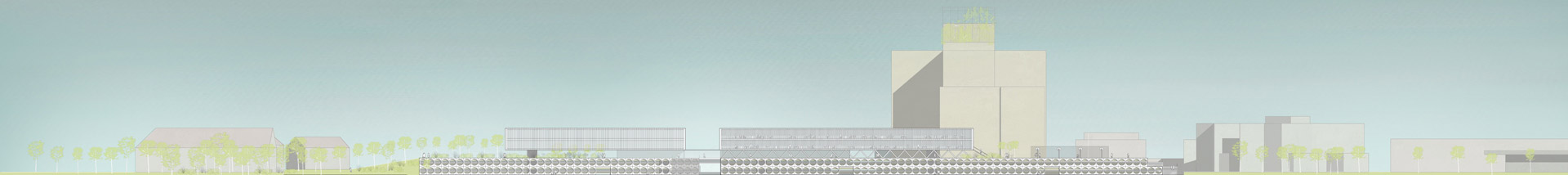 Natural materials and ecological, sustainable construction determine our proposal both constructively and atmospherically. Simple technical solutions with a high proportion of passive measures are the aim of our proposal. Due to the louvers on the facade (passive shading) and openable facades/windows, ventilation and cooling can be largely dispensed with or reduced to a minimum on the upper floors. Heating is by means of low-temperature system, with simple large-area radiators along the facades. The use of geothermal energy would lend itself to this system. The roofs offer space for large-scale photovoltaic systems.