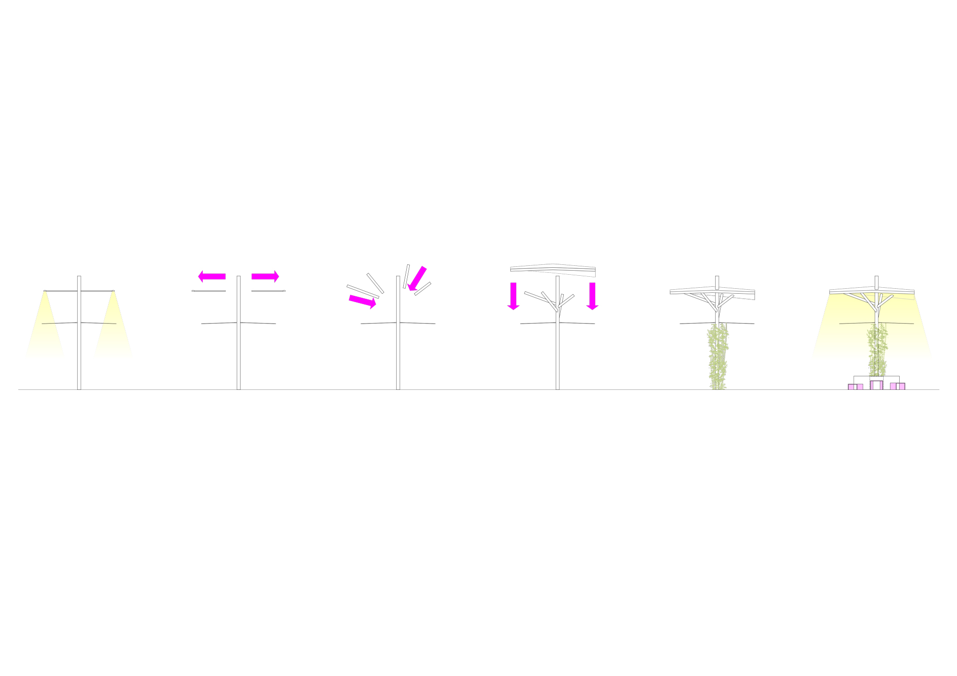 The existing lighting and catenary poles will be freed from the luminaries and provided with a new substructure as support. In the ground area, the masts are now provided with a statically effective sheathing, which also serves as a seating and/or plant trough. This generates additional moisture and lowers the temperature. We hope to initiate a debate with our proposal. A debate about a central inner-city location that is in urgent need of adaptation and a clear qualitative upgrade.