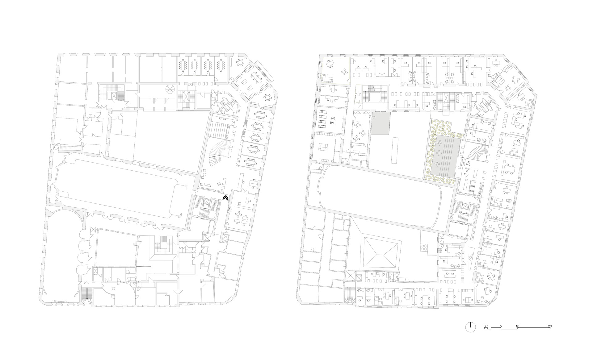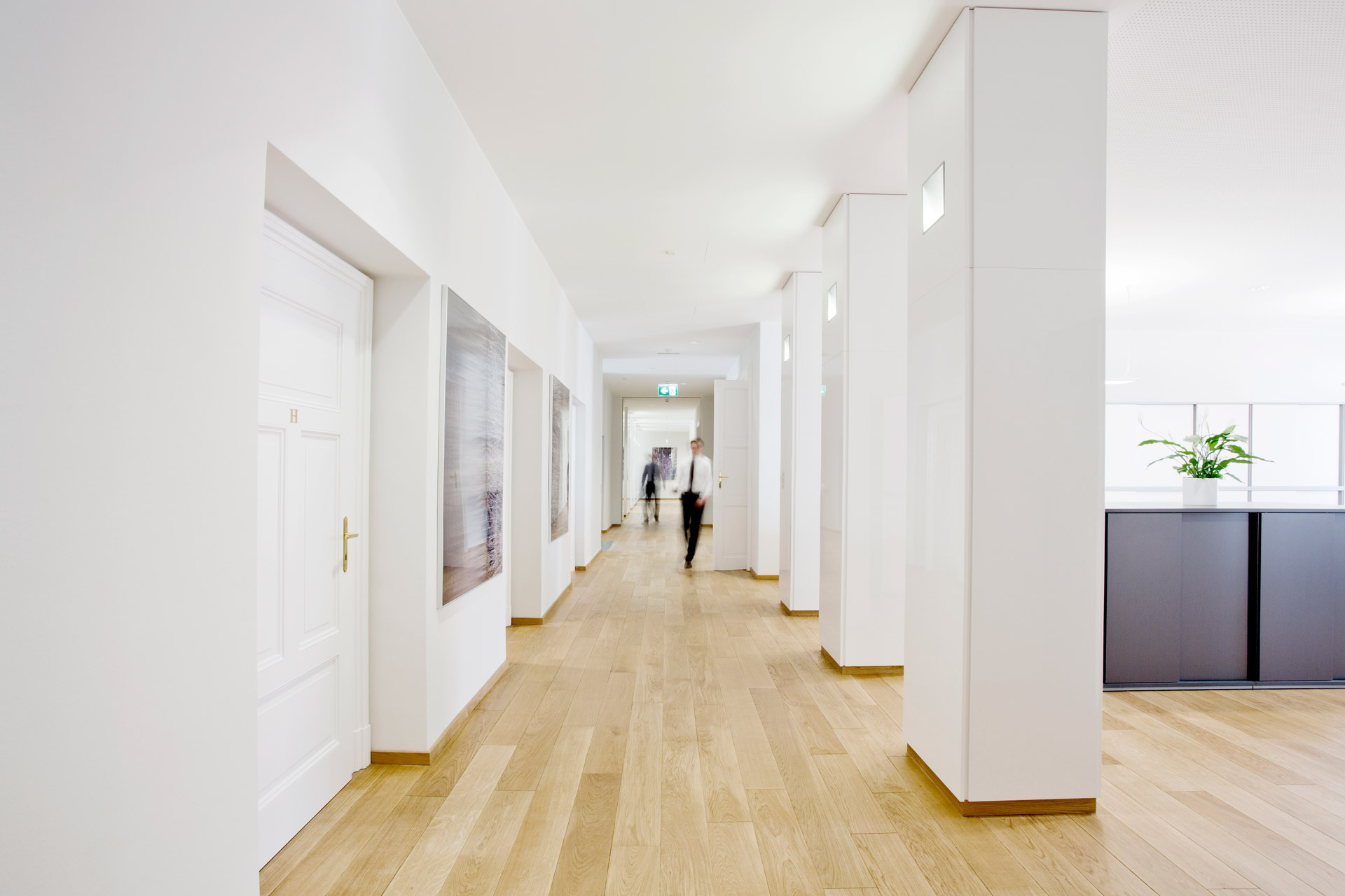 The ScherbaumSeebacher law office in Graz moved to the former premises of the Steiermärkische Sparkasse bank on the 2nd and 3rd floors of the Congress Graz. The historic building (built in 1883 by Mathias Seidl for the Steiermärkische Sparkasse bank) houses various event locations, such as the Graz musical society (Grazer Musikverein), the Stefaniensaal, the Steiermarksaal, the Kammermusiksaal, and the Graz Casino. The property is located in the heart of Graz’s old town in the direct vicinity of the main square and is therefore perfectly connected to the city’s center. In addition, the law office features several balconies and an access point to a rooftop terrace in the courtyard of the Congress ensemble. The existing rooms are symmetrically built. A central access corridor with a total length of approx. 180m and a width ranging between 1.8 and 2.3m connects the individual rooms of the u-shaped structure.
