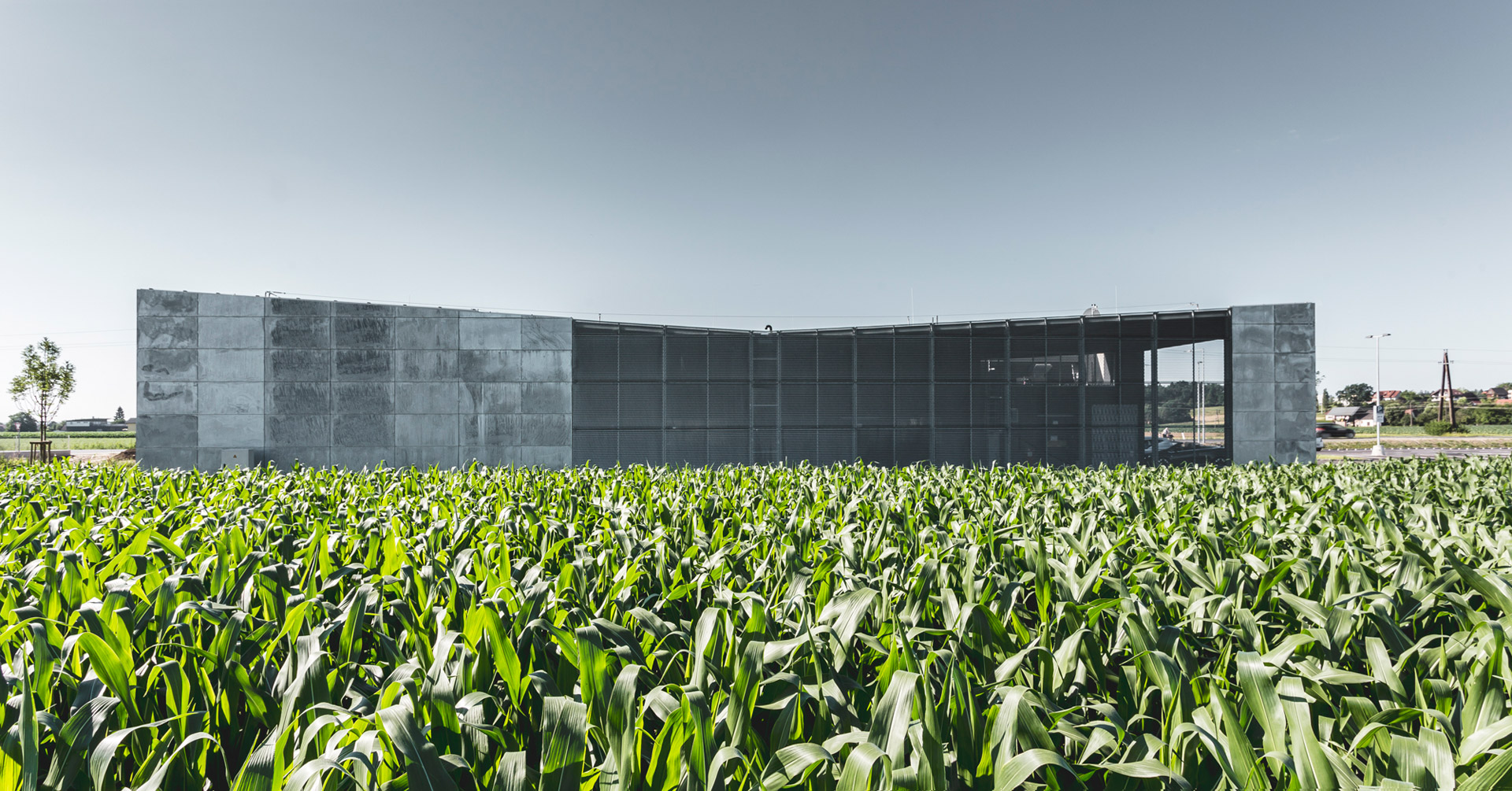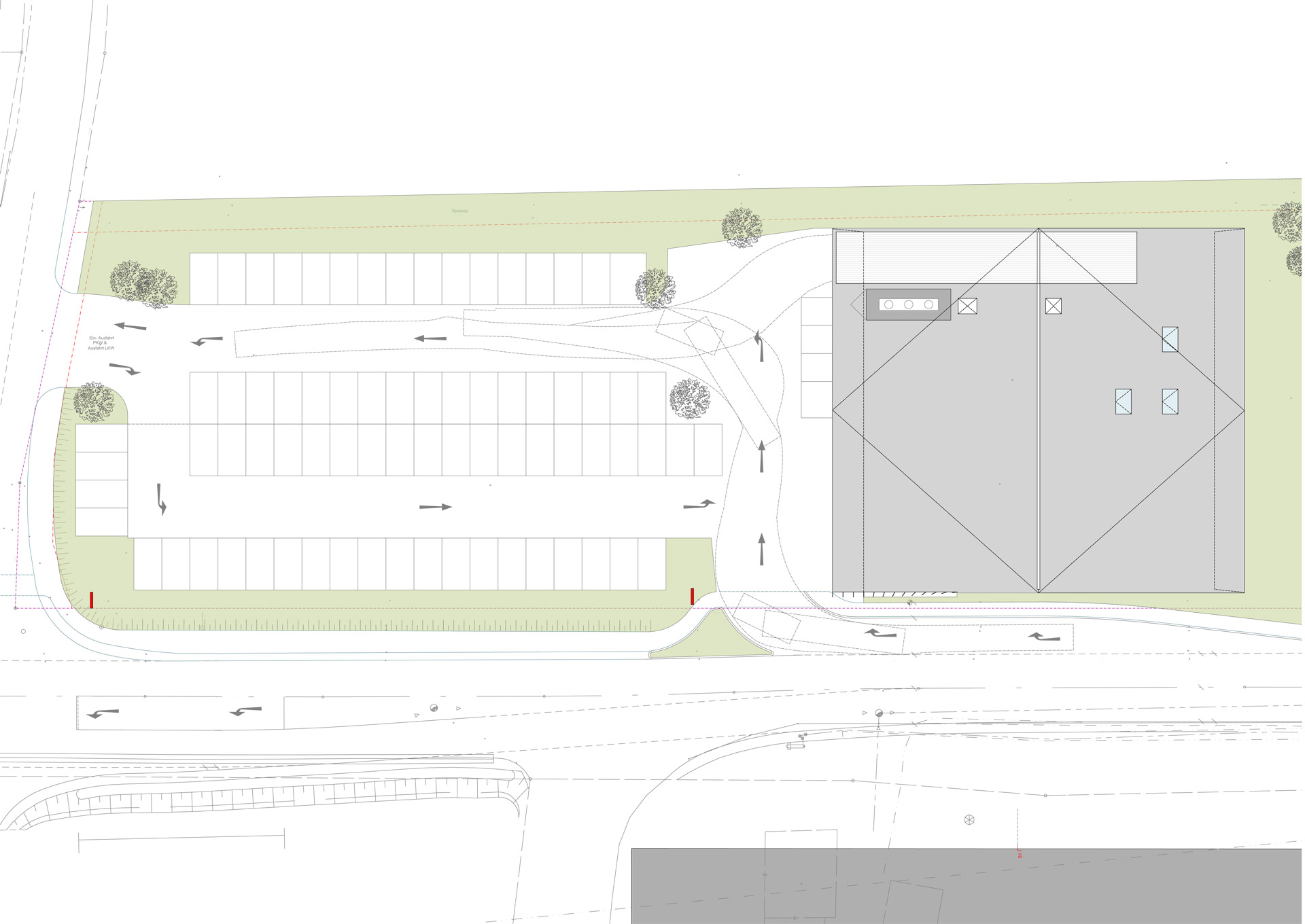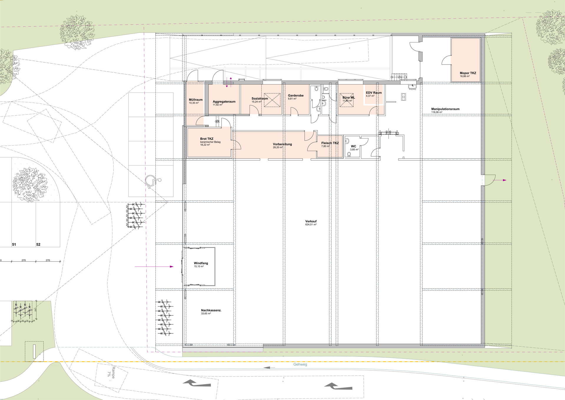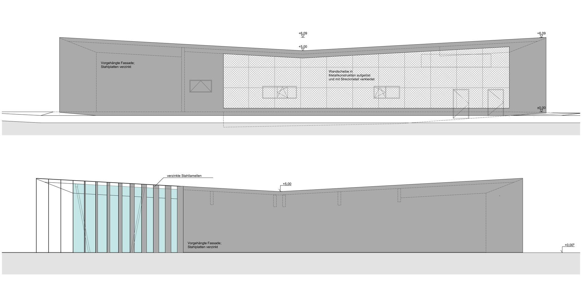 The façade is made of galvanized steel sheet which dissolves into lamellas at the entrance side, thus additionally opening up and marking the access side. At the funnel openings, the market is generously glazed to enhance the brine effect to the inside.