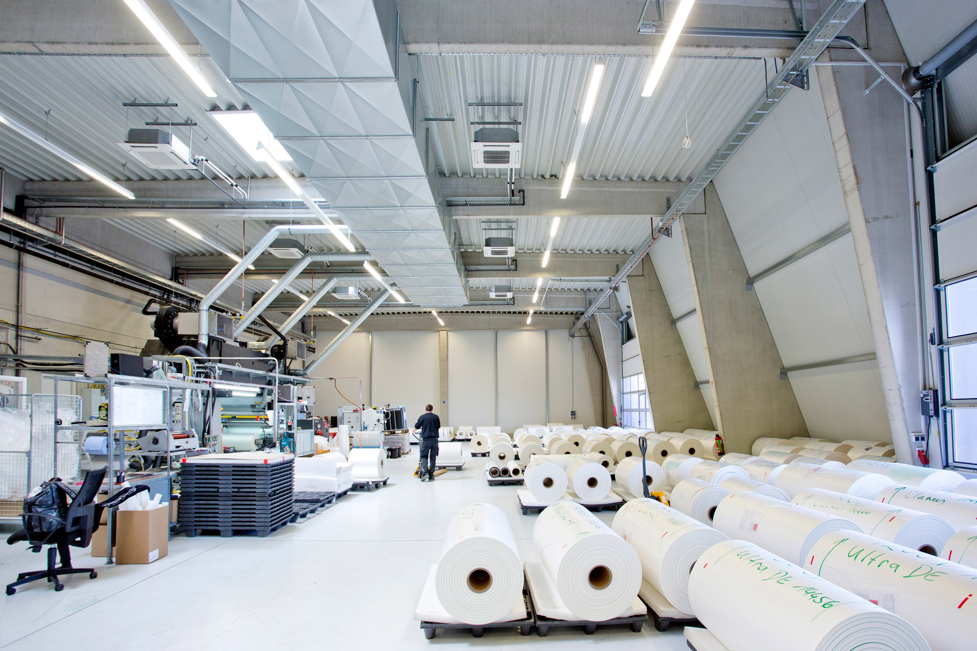 The backbone divides production into the two main production units: the film production, which is kept dust-free by means of positive pressure, and the processing area in which the films are cut, stored, packaged, and delivered.