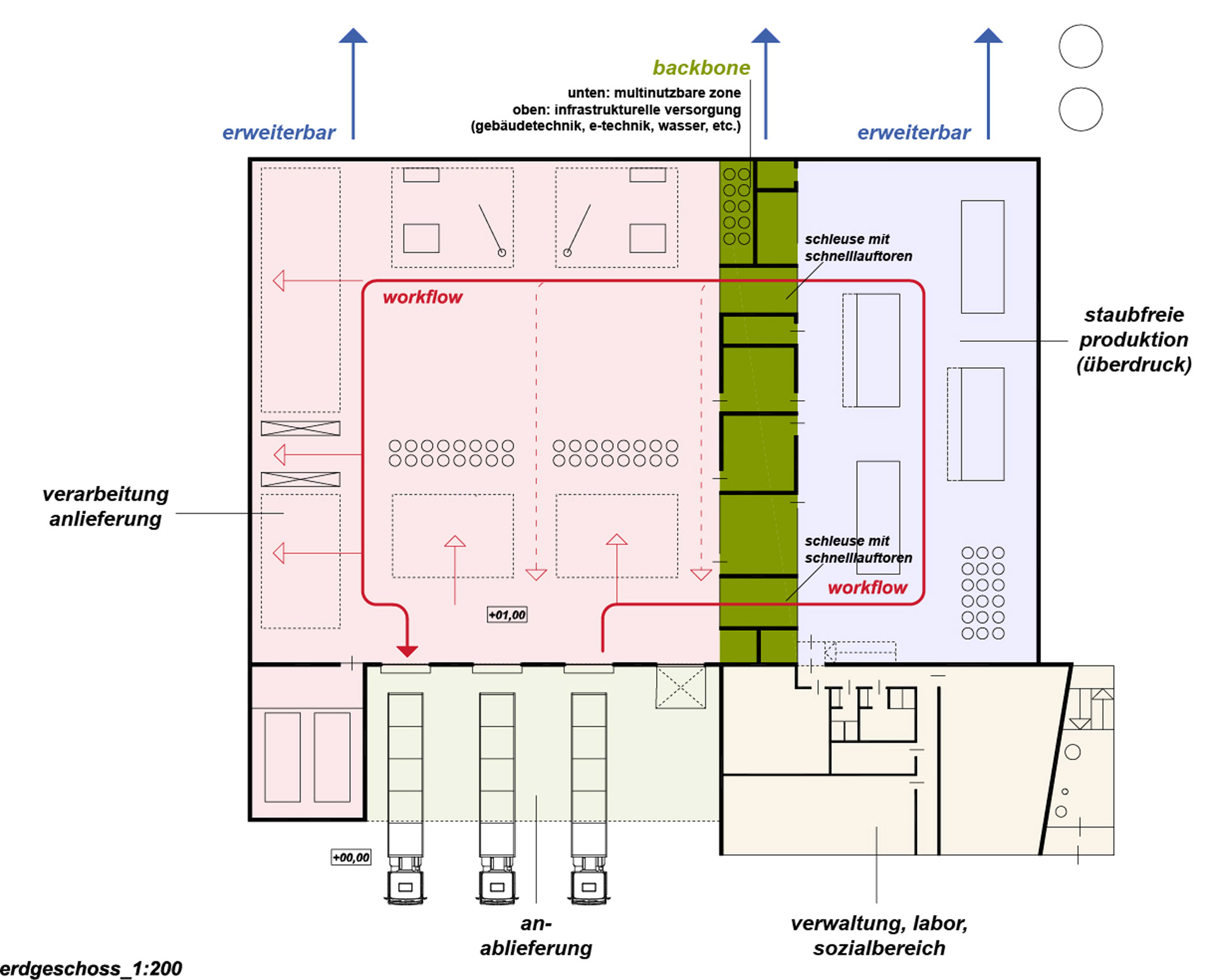 The ground floor area of the backbone represents a multi-use zone for both production units with operations management offices, warehouses, workshops, and so on. There are also two air locks with high-speed doors as a transition between dust-free production and processing. The entire infrastructural supply (building technology, ventilation, electrical engineering, media, etc.) for both production zones is located in the upper area of the backbone.
