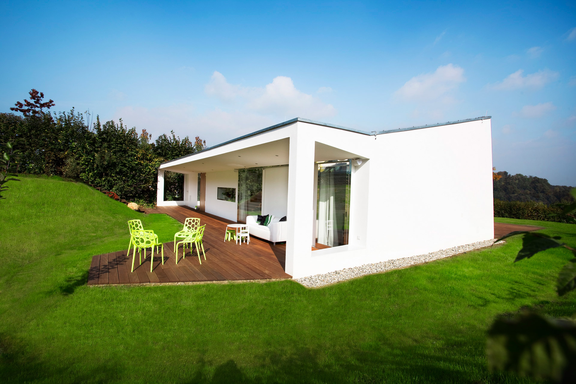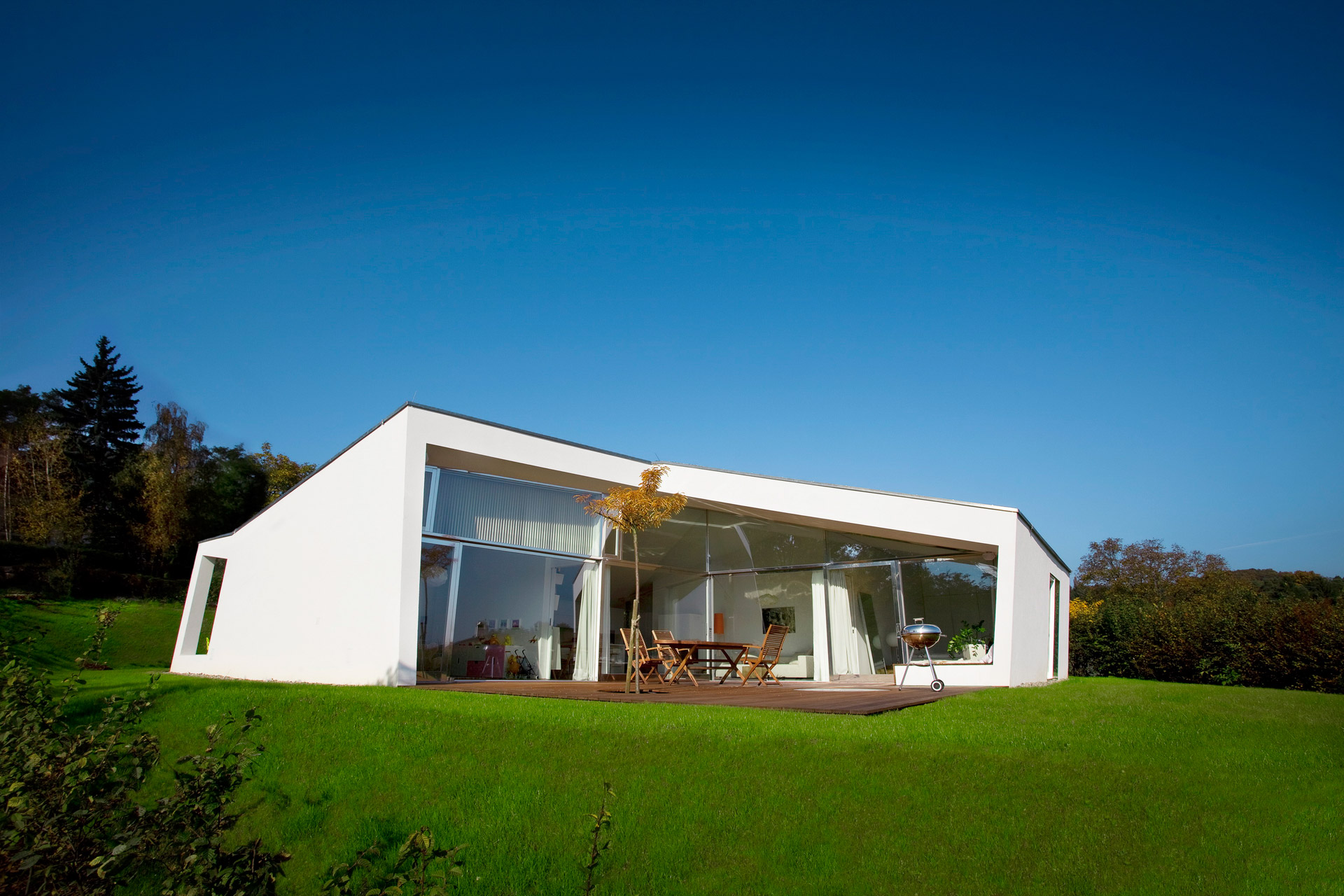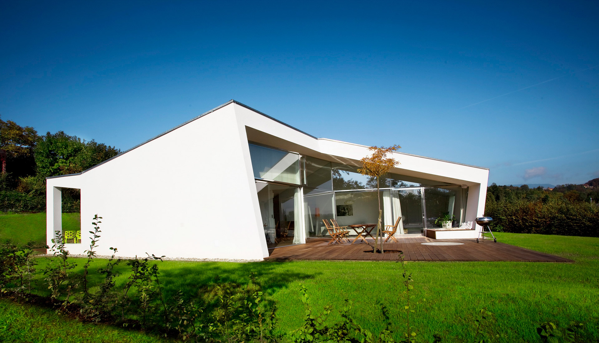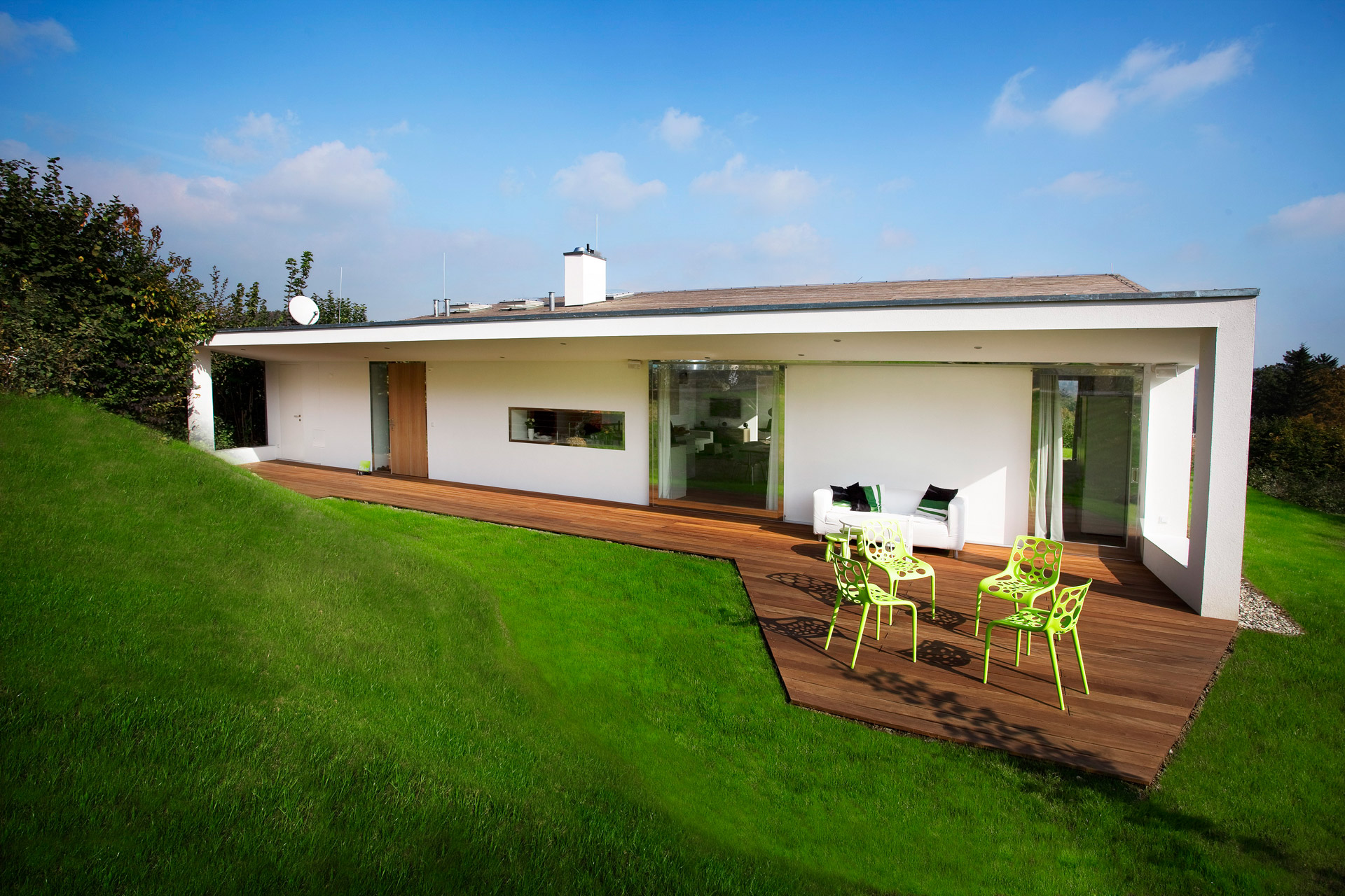 This folding spatially differentiates the individual areas, thereby providing more excitement to the entire complex. Due to the spatiality and “perspectivity” created in this way, the house looks different from every angle. The building is a massive brick construction with concrete walls and a reinforced concrete roof. This roof also serves as a thermal storage mass to provide a pleasant indoor climate and is covered with wood outside. This shades the planking and visually blends the terrace and roof into a unified whole.